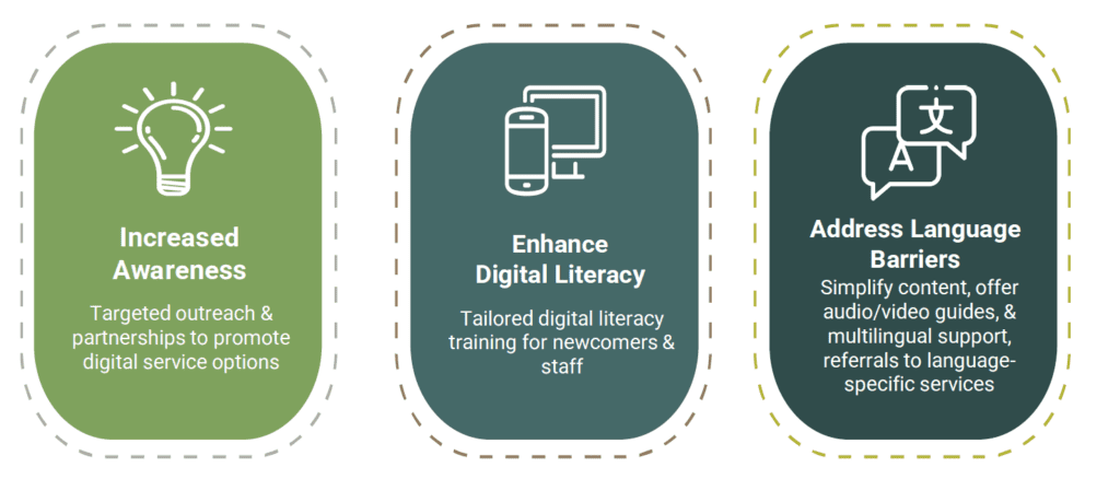 The findings from the research highlight significant barriers faced by newcomers in accessing digital settlement services. Factors such as language barriers, lack of access to affordable technology, and limited awareness of available digital services contribute to these challenges. Additionally, issues like digital training gaps and inadequate multilingual resources exacerbate inequities. Almost one in five (16.7%) of service providers did not feel comfortable delivering digital services.